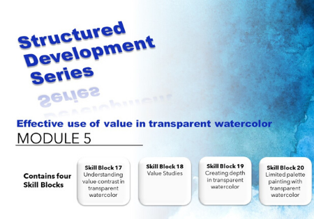 This "Module" is a bundle of four Skill Blocks focused on the effective use of Value in transparent watercolor.